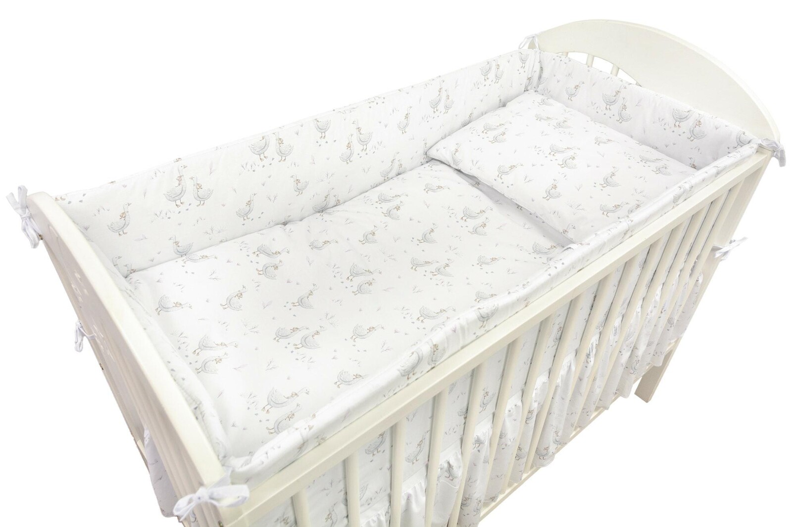 Kvalitní bavlněná souprava do dětské postýlky s mantinelem kolem celé postýlky se vzorem husiček.