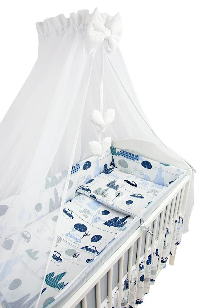 Krásná 4 dílná sada do dětské postýlky s motivem autíček v modré barvě. Povlečení má zapínání na zip.