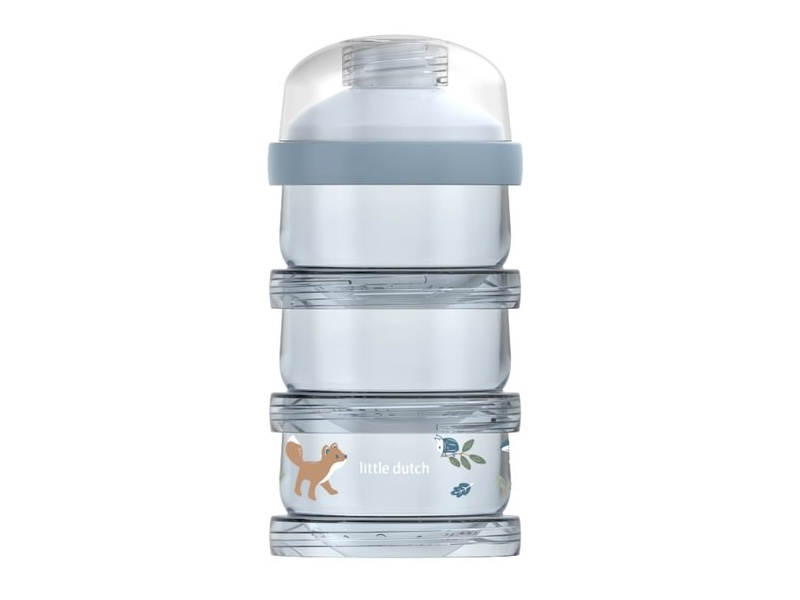 Třídílná nádoba na sušené mléko Little Dutch Forest Friends nabízí jednoduchý a hygienický způsob přípravy kojeneckého mléka doma na cestách. Nádoba obsahuje tři stohovatelné kelímky, které jsou jednotlivě uzavřeny šroubovacími víčky. Praktické nasýpací víčko nahoře usnadňuje dávkování sušeného mléka do lahve.