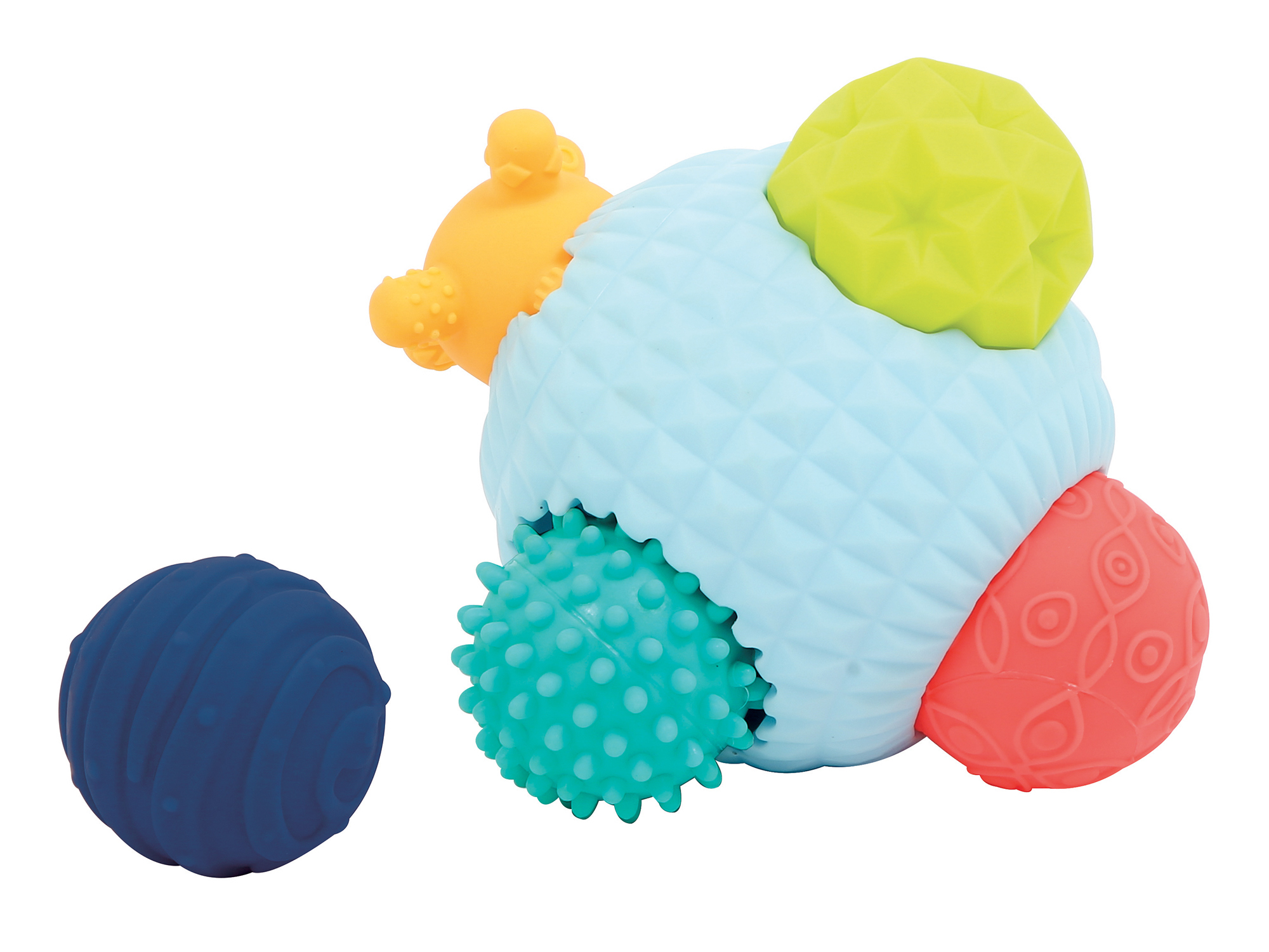 3D puzzle z míčků tvoří jeden velký míček s otvory a 5 menších míčků s různorodými texturami. Míčky, které se liší barvou, velikostí i povrchem povzbuzují dětskou zvědavost a lákají ke zkoumání. Každý míček pasuje do jednoho z pěti otvorů ve velkém míčku. Děti budou nadšeně malé míčky z otvorů vytahovat a pak se snažit je vrátit na své místo.