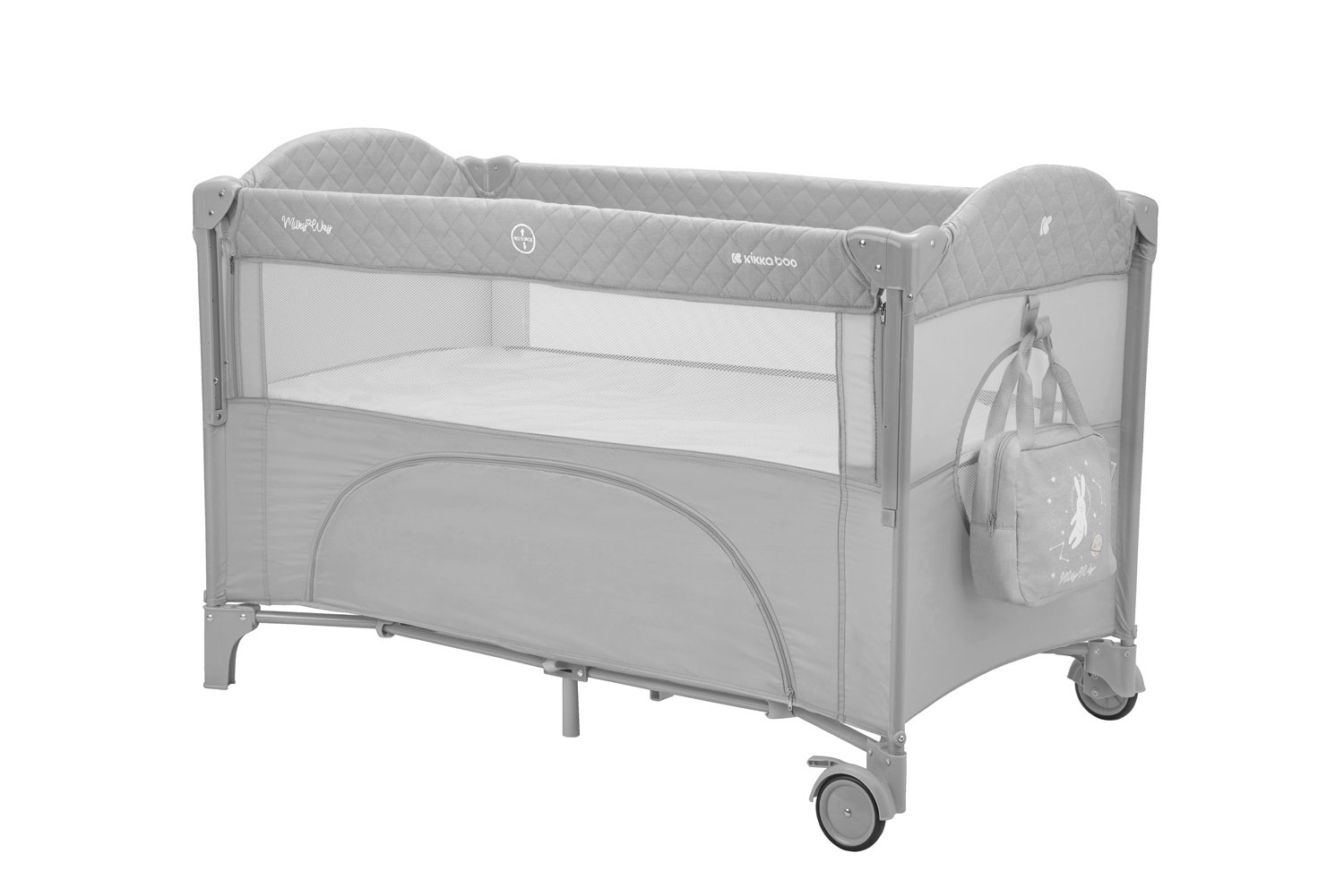 Cestovní postýlka KikkaBoo Milky Way nabízí dvě úrovně výšky uložení matrace dle věku dítěte a možnost stažení bočnice pro přistavení k posteli rodičů. Vysoko uložená matrace pro děti od narození do cca 6 měsíců usnadňuje rodičům přístup k miminku. Nízká poloha matrace je určena pro děti od 6 do 36 měsíců.